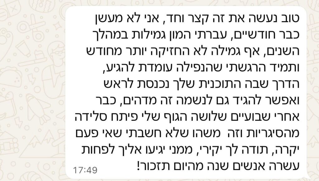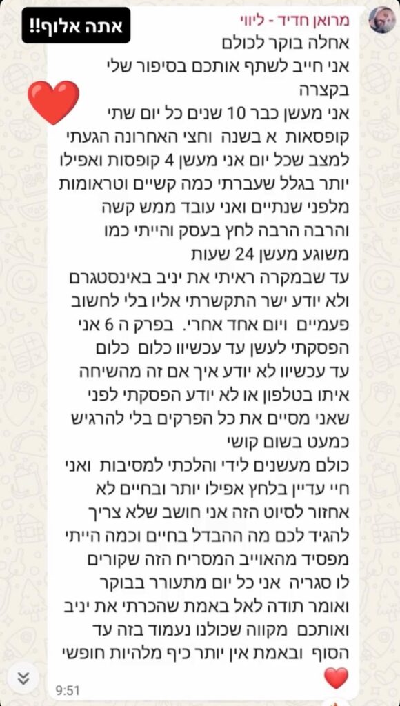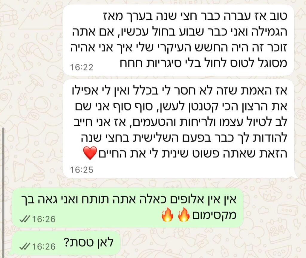 לומדים איך לעבור לאורח חיים שלם, שבו חוויית החופש מהעישון לא רק נשמרת – אלא הולכת ומתחזקת עם הזמן, עם תחושת גאווה, קלילות ובריאות.